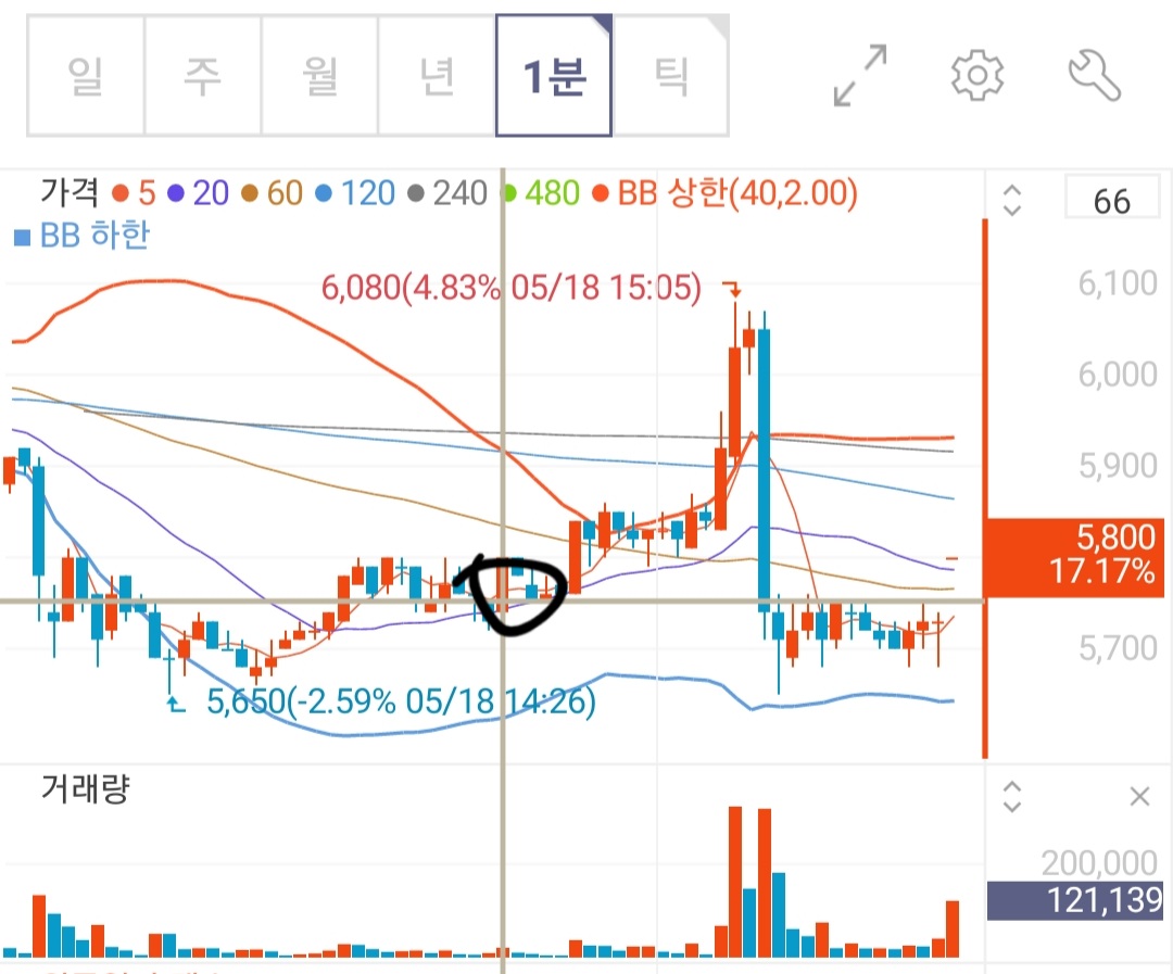 오늘 14:50 경 현재가였던 5,750 원이 매수가였고, 15:05 에 매수가 대비 5.7% 수준인 6,080 원을 찍고 내려온 걸 볼 수 있습니다.